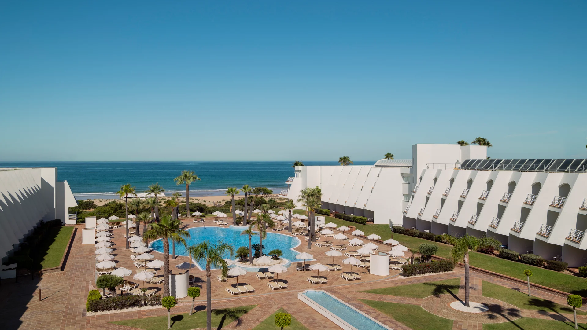 Il y a des hôtels où l'on arrive, et des hôtels où l'on atterrit. L'Iberostar Waves Royal Andalus fait partie de la seconde catégorie. Dès que l'on franchit l'entrée, l'air change, chargé d'iode et de pins parasols, et la lumière blanche de la Costa de la Luz impose son rythme lent. Chiclana de la Frontera, à une quarantaine de minutes de Jerez, n'a pas la frénésie des grandes stations balnéaires espagnoles, et c'est précisément pour cela qu'on l'aime. L'hôtel s'étire entre le domaine végétal et l'Atlantique, avec en prime un accès privé à la plage de La Barrosa, l'une des plus belles plages de sable fin de la province de Cadix.