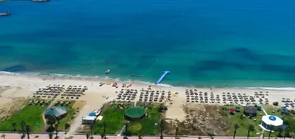 La plage privée est accessible à pied depuis l'hôtel, une petite route étant à traverser pour y accéder. Les activités sportives incluses dans le séjour sont nombreuses et concrètes : tennis, tennis de table, mini-foot, pétanque, beach-volley, fléchettes et tir à l'arc. Des tournois sportifs sont organisés régulièrement par l'équipe d'animation. La salle de fitness est ouverte de 10h00 à 17h00. Pour les amateurs de tennis en soirée, l'éclairage des courts est disponible en supplément.