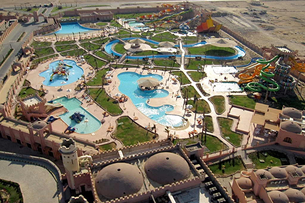Cinq piscines extérieures et un parc aquatique de dix toboggans : l'offre aquatique sur place est généreuse et couvre plusieurs rythmes de vacances. La plage privée de sable est aménagée avec chaises longues et parasols en accès direct, bordée par la mer Rouge dont la transparence et la richesse sous-marine font la réputation de ce littoral. Des serviettes de piscine et de plage sont mises à disposition. Un solarium aménagé de transats et parasols complète l'offre de détente en plein air.
