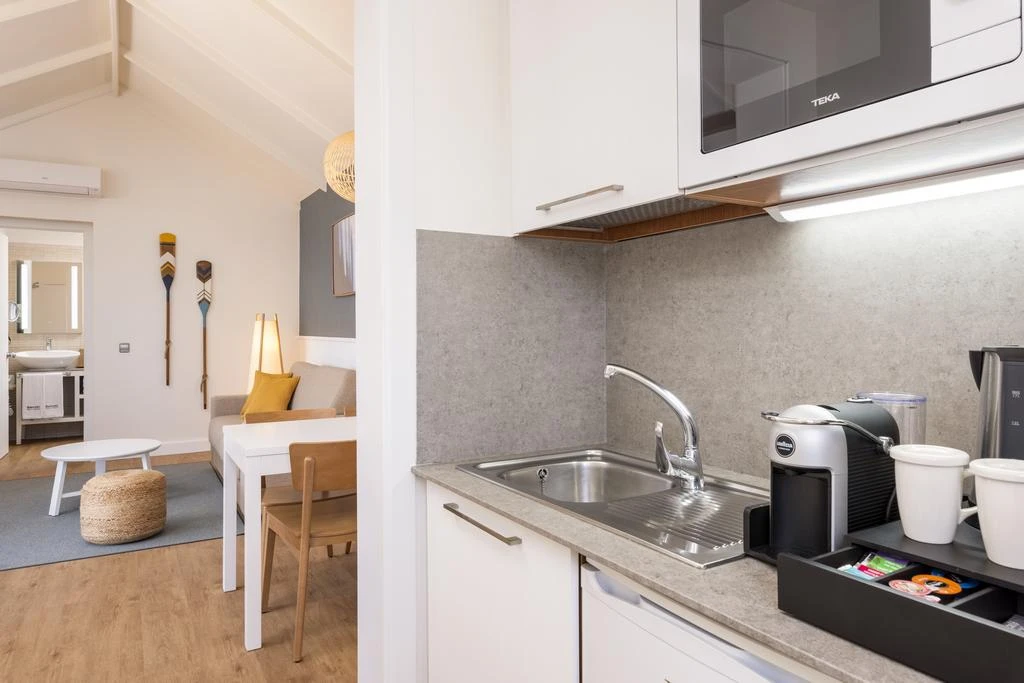 On pose les valises dans l'un des 301 studios ou bungalows qui s'étalent en tranquilles rangées dans les jardins du resort. L'architecture basse, jamais au-dessus de deux niveaux, donne immédiatement une sensation d'espace et de calme. Les Studios Deluxe de 40 m² accueillent confortablement deux adultes, ou deux adultes et un enfant, avec leur balcon ou terrasse privatif, leur kitchenette équipée d'un micro-ondes, d'un réfrigérateur et d'une bouilloire, leur télévision à écran plat et leur climatisation. Pour les familles plus nombreuses, les Bungalows Superior de 52 m² offrent une vraie séparation entre le salon-salle à manger et la chambre, avec une capacité pouvant aller jusqu'à trois adultes et un enfant, ou deux adultes et deux enfants. Certaines unités sont adaptées aux personnes à mobilité réduite, sur demande lors de la réservation.