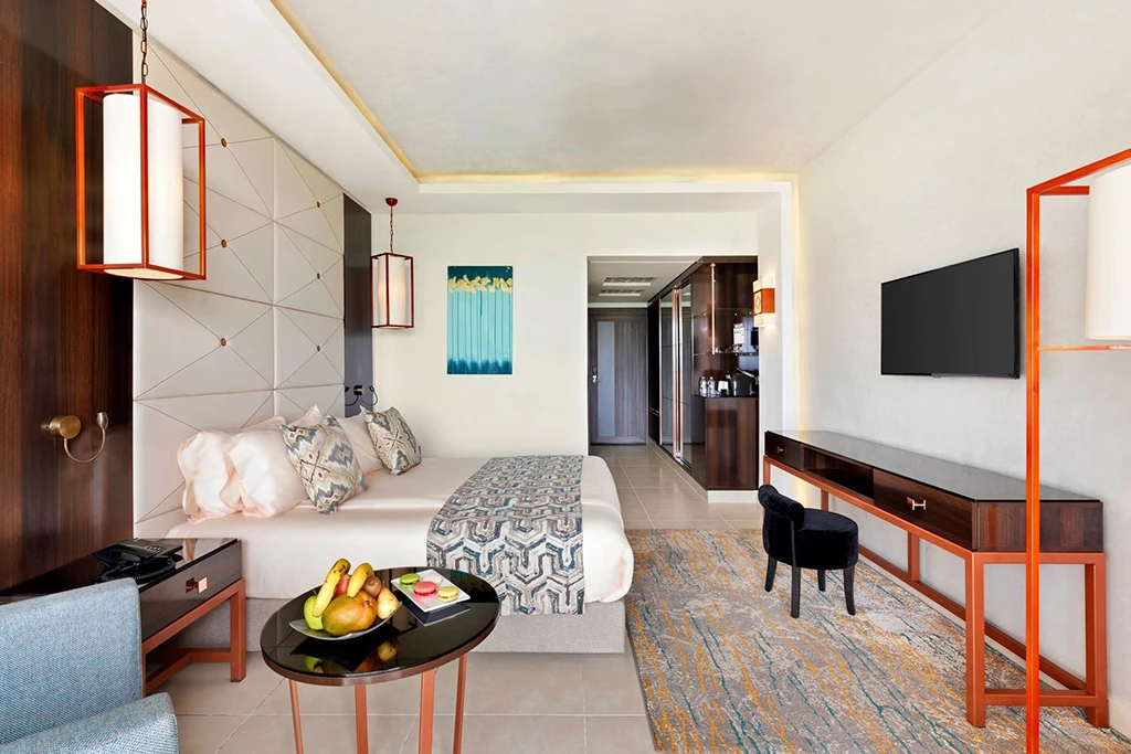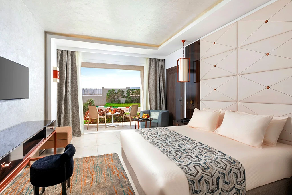 Vous arrivez à l'aéroport d'Agadir à 33 km de là. Le transfert prend environ une heure, longeant la côte atlantique avant de vous déposer à Taghazout. L'hôtel s'ouvre sur un village de pêcheurs authentique mais structuré : la modernité a su s'y glisser sans écraser le charme local. À la réception 24h/24, on vous remet les clés de votre chambre. Les 262 chambres de l'établissement ne sont pas toutes identiques. Vous avez le choix entre les Deluxe Vue Jardin, Vue Mer ou Vue Piscine (30 m² pour deux adultes), ou les chambres avec piscine privée (35 m², également pour deux adultes). Chacune dispose d'une terrasse ou d'un balcon, d'une climatisation individuelle, d'une connexion WiFi, d'une télévision à écran plat, d'un minibar réapprovisionné quotidiennement, d'un plateau de courtoisie avec thé et café, et d'une salle de bains équipée d'une douche et d'un sèche-cheveux. Le décor est raffiné sans être étouffant, moderne sans renier le contexte marocain. Vous respirez dès que vous posez votre sac.